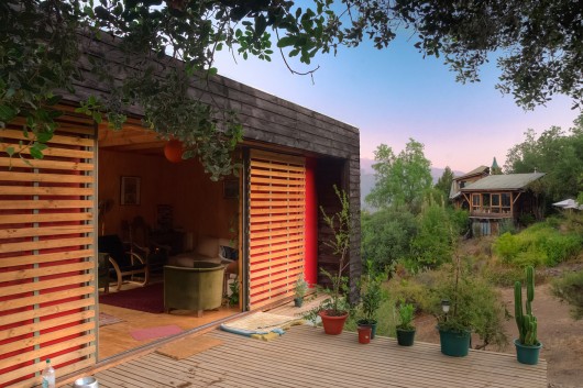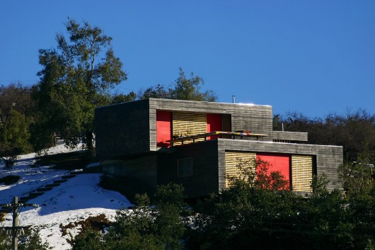 The commission was to design a small house for a young couple, to be placed north of an existing house on the same family lot. The site, located at the suburb of El Arrayán and approximately 1000 meters above sea level, has a steep slope to the south-east, that opens a dramatic view of the valley in that direction. The house is organized in two parallel volumes, displaced to sit on the uneven terrain and both facing the view to the east. The lower volume accommodates two bedrooms, each with space for desk, closet and bathroom.