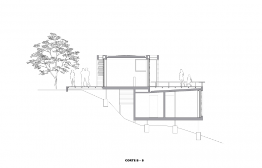 The upper volume is a single space for living room, dining and kitchen. The entrance is located between both volumes at an intermediate level. The guest bathroom and laundry room are located here too. Two sliding windows at each side of the upper volume can be fully opened to the east and west views. Both openings give access to a terrace. The west terrace opens to the ground level in a relatively flat area and allows to walk through the garden and existing trees.